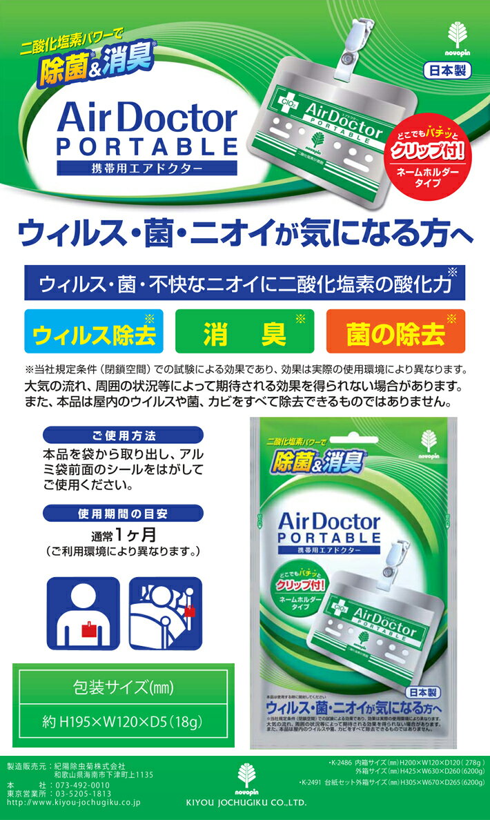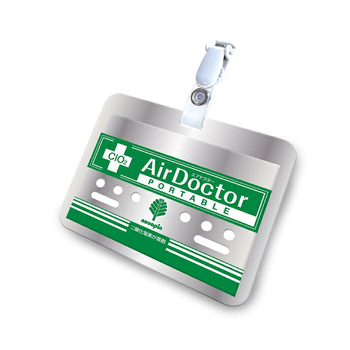 【注目の品薄商品】固形二酸化塩素パワーで空間を除菌&消臭!■目に見えない空気中のウィルスや腐敗菌、カビ等の微生物の生育を抑制し、効果的に除菌! ■生活空間の気になるニオイも分子レベルで消臭! 新感覚、携帯用 【 除菌 消臭 エアドクター ポータブル 】 エアドクター ポータブルは、写真のようなシルバーのアルミカバーに入った二酸化塩素剤を、ネックストラップではなく、どこでもクリップで携帯にするだけで、ご自身の周りに浮遊するウィルスや細菌のタンパク質を二酸化塩素分子の力で酸化し、ウィルス・細菌は活動する力を失ってしまいます。